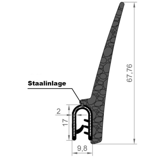 Zwart klemprofiel of afdichtingsprofiel van volrubber met staalinlage en EPDM mosrubber flap. U kunt deze zeer gevarieerd inzetten ter bescherming of afwerking in de scheepvaart, metaalindustrie en de automobielsector.
